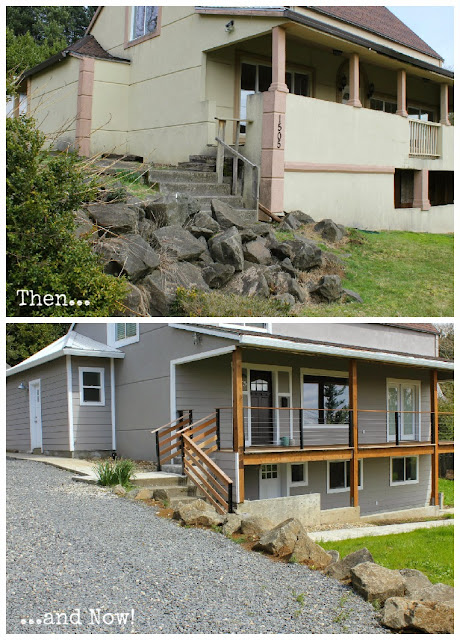 ...And now that it is finished, it looks a million times better! We removed most of the stucco and replaced it with Hardiplank siding, replaced the front door, added windows and doors, added new gutters and completely removed the front porch/railing and built it new.
